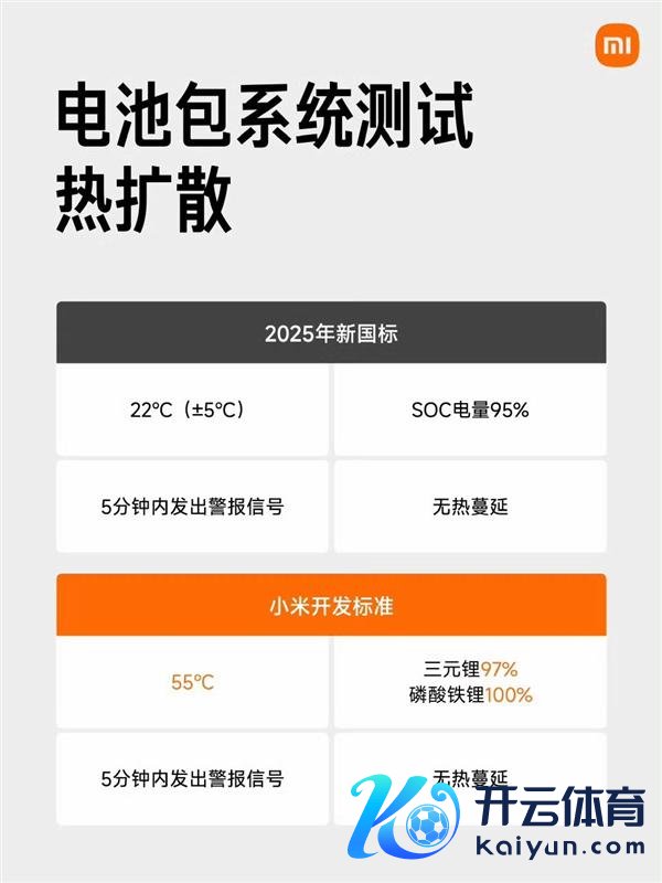 电板温度和电板包电量:新国标要求电板包温度 22 ℃正负 5 ℃,SoC 为 95%,单体电芯失控 5 分钟内发出报警信号,5 分钟内烟气不导致乘员舱发生危境,临了无整包热失控;小米汽车尺度为电板包温度 55 ℃,SoC 为 97%~100%,对热闭幕要求更高;