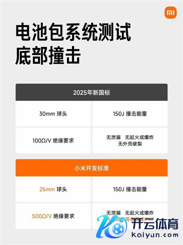 电板底部球击测试:新国标要求 30mm 撞击头,150J 能量,撞后无败露,外壳龙套,生气或爆炸,且绝缘中意 100 Ω /V ;小米汽车尺度为 25mm 直径撞击头(球头越小,压强越大,驻扎难度更高),撞后绝缘中意 500 Ω /V,况且咱们还罕见秩序了试验后中意要中意 IPX7 短时浸水;