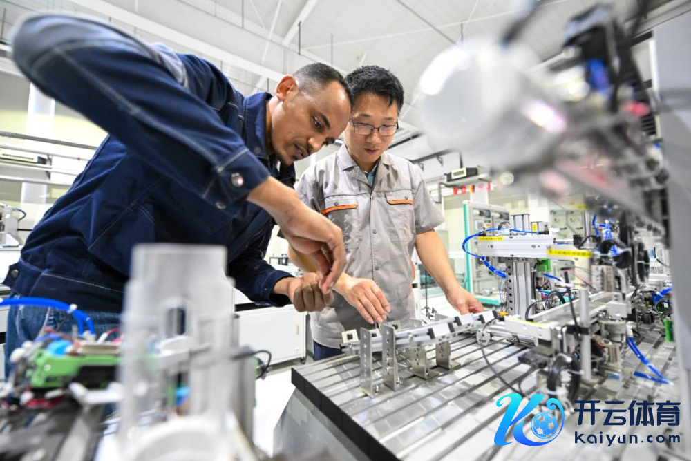 ▲埃塞俄比亚后生涂则钢是埃塞俄比亚鲁班工坊主干教授,正在天津职业本领师范大学教授钟平的指令下对一条微型化分拣机进行调试操作。新华社记者 孙凡越 摄