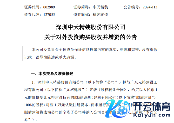 12月4日晚间,中天精装(002989)发布公告,拟与广东元榕缔造工程有限公司(以下简称“元榕缔造”)签署《股权转让合同》,商定以1元的价钱受让元榕缔造执有的顺瑜(深圳)建筑有限公司(以下简称“顺瑜建筑”)100%的股权。