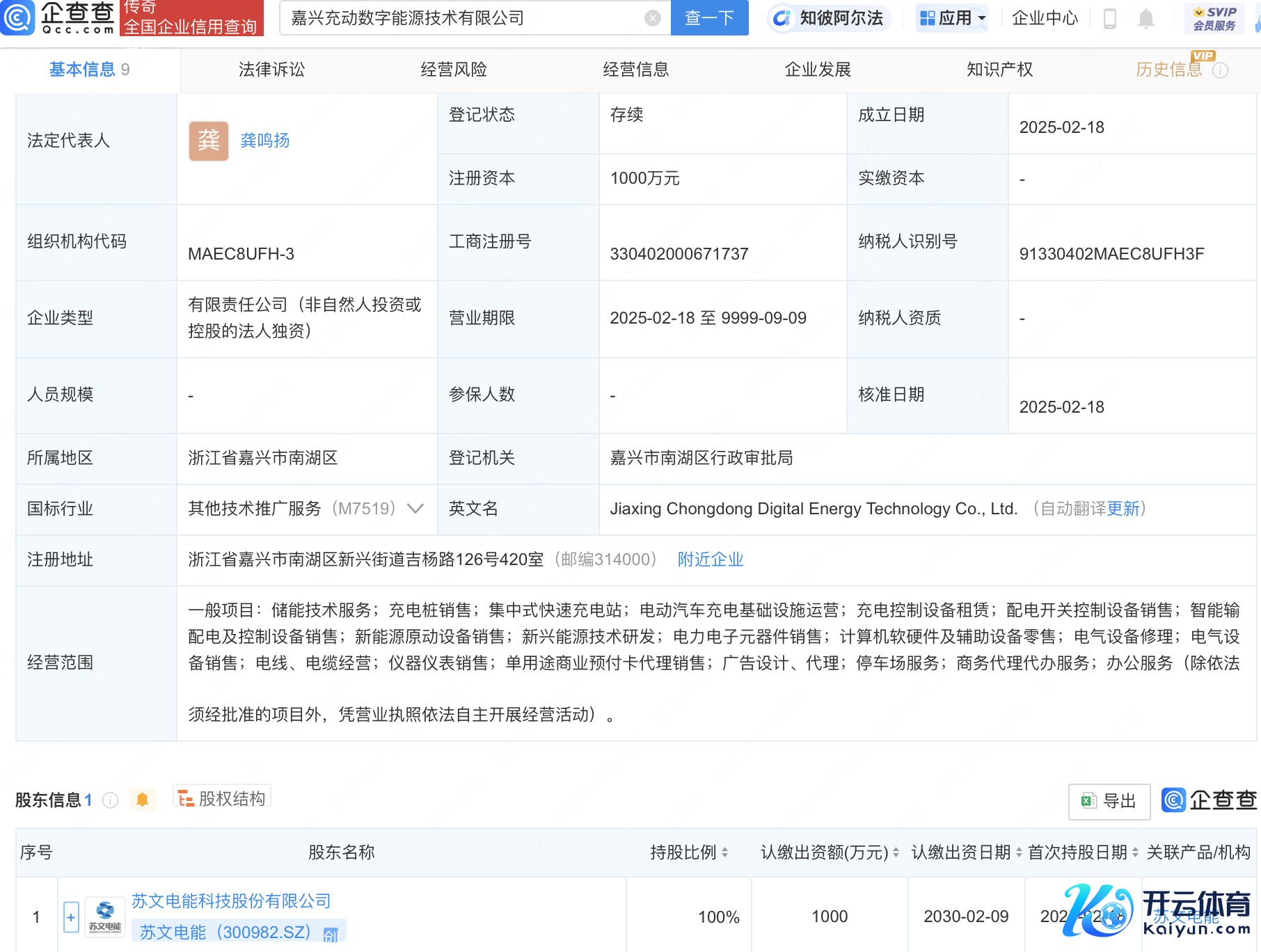企查查APP清晰欧洲杯体育,近日,嘉兴充动数字动力技巧有限公司设置,法定代表东说念主为龚鸣扬,注册成本1000万元,认识范围包含:储能技巧劳动;充电桩销售;汇集式快速充电站;电动汽车充电基础关节运营等。企查查股权穿线路出,该公司由苏文电能(300982)全资握股。
