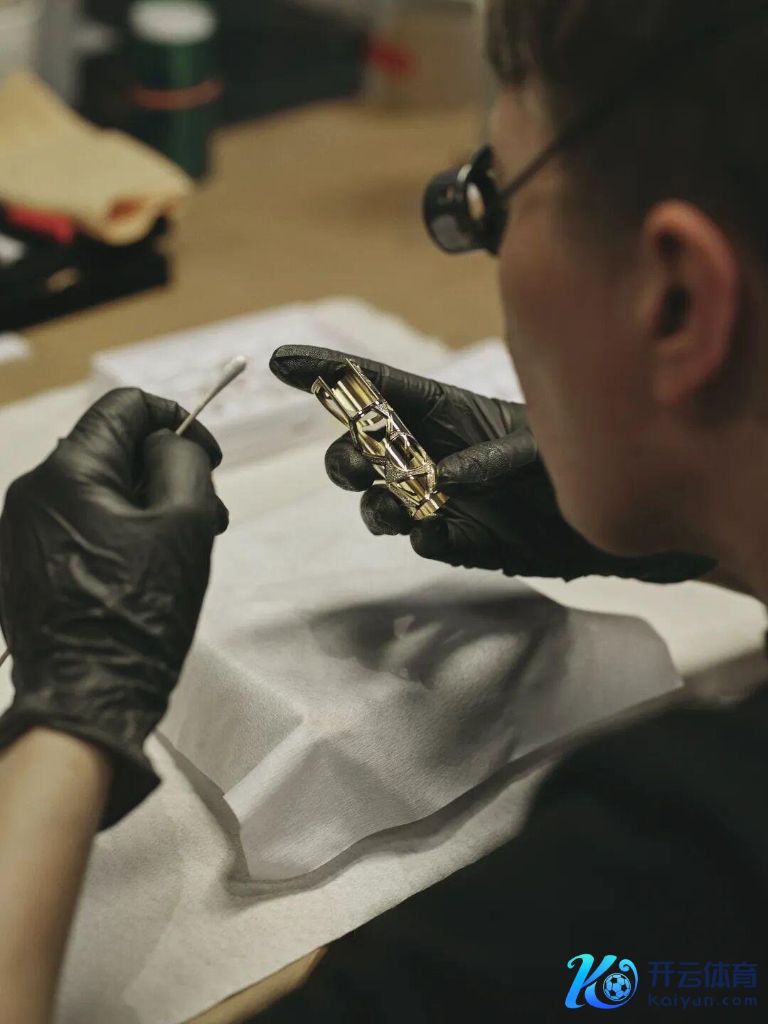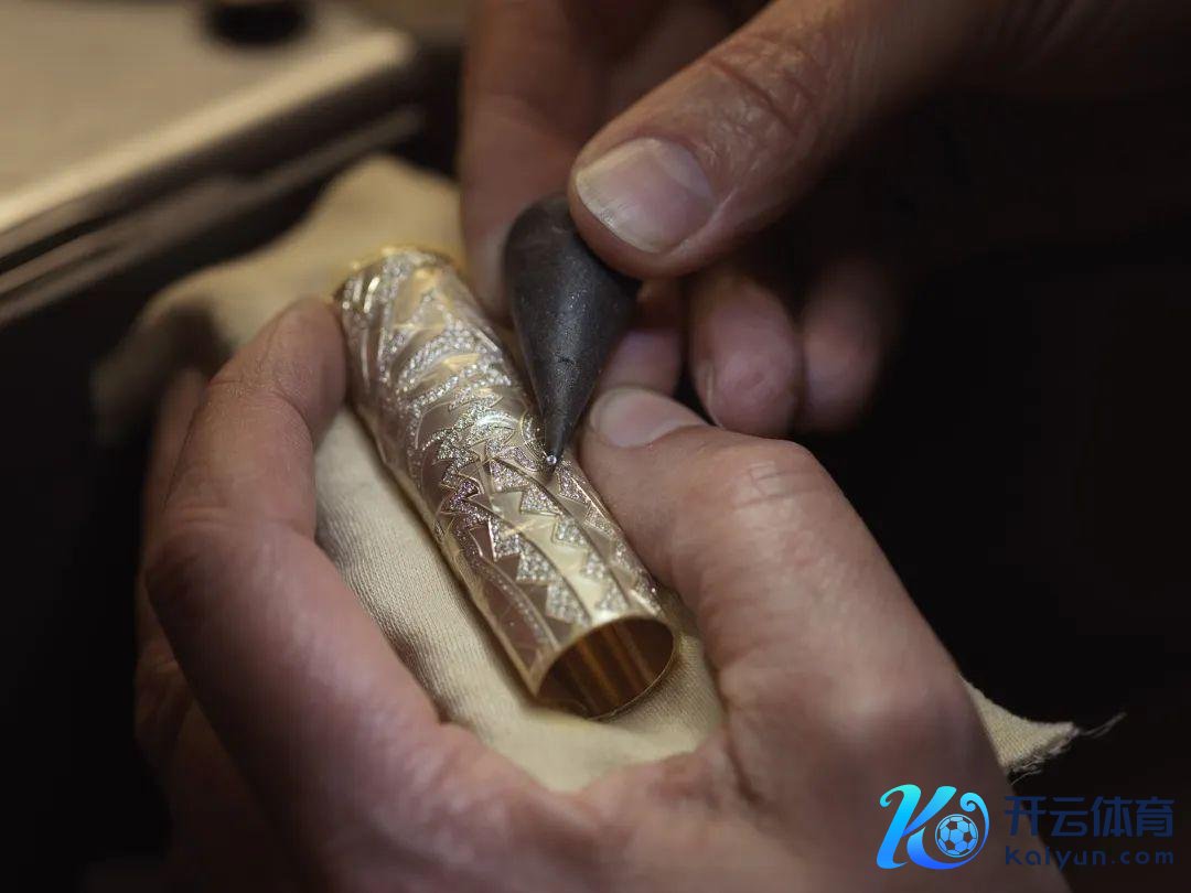 这种技法需要工匠用特制的雕刻刀,在 18K 实金的笔杆上一点不苟地手工点刻,通过实现点的疏密、浅深,来营造出光影的隐私变化和肌肤的轻柔质感。