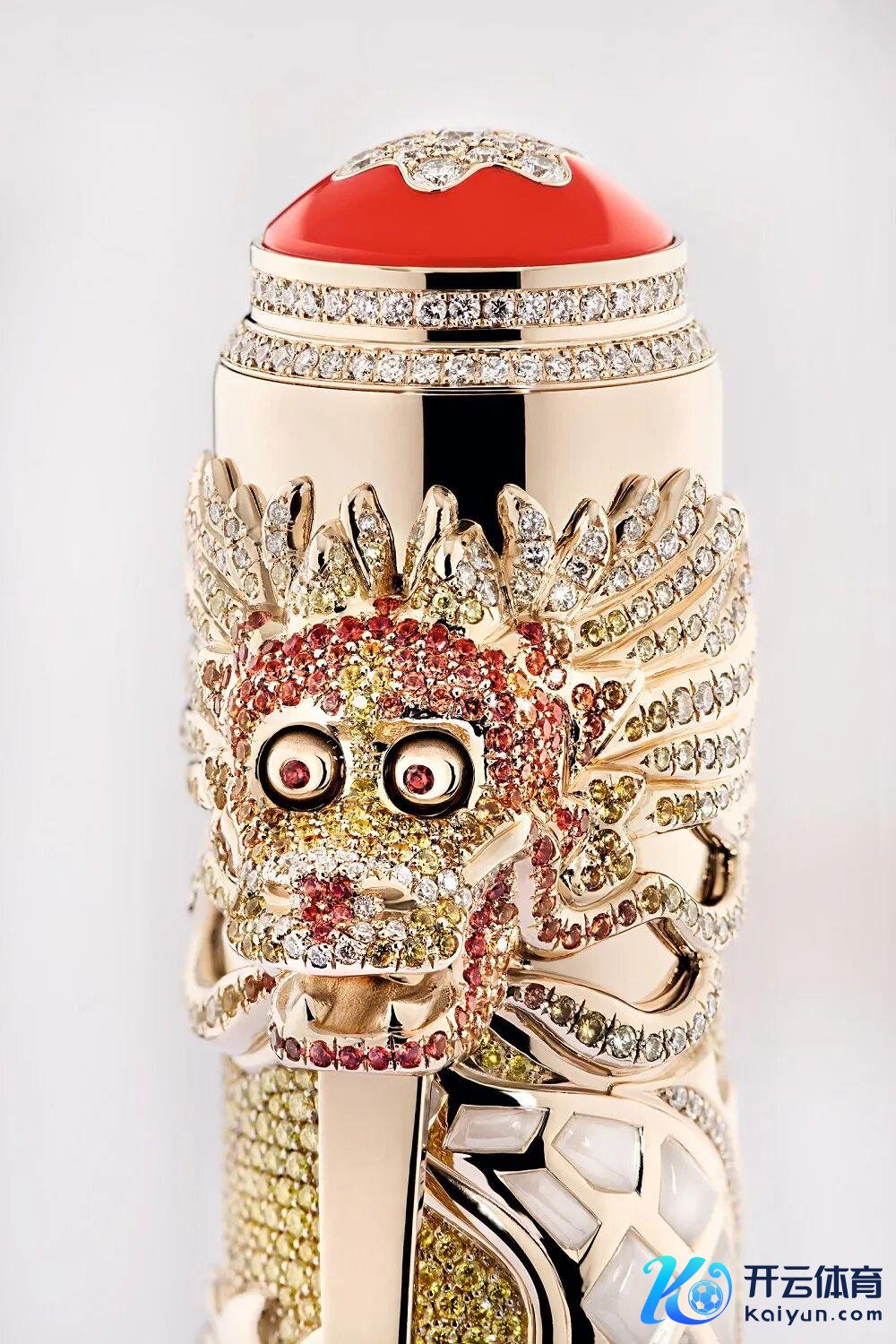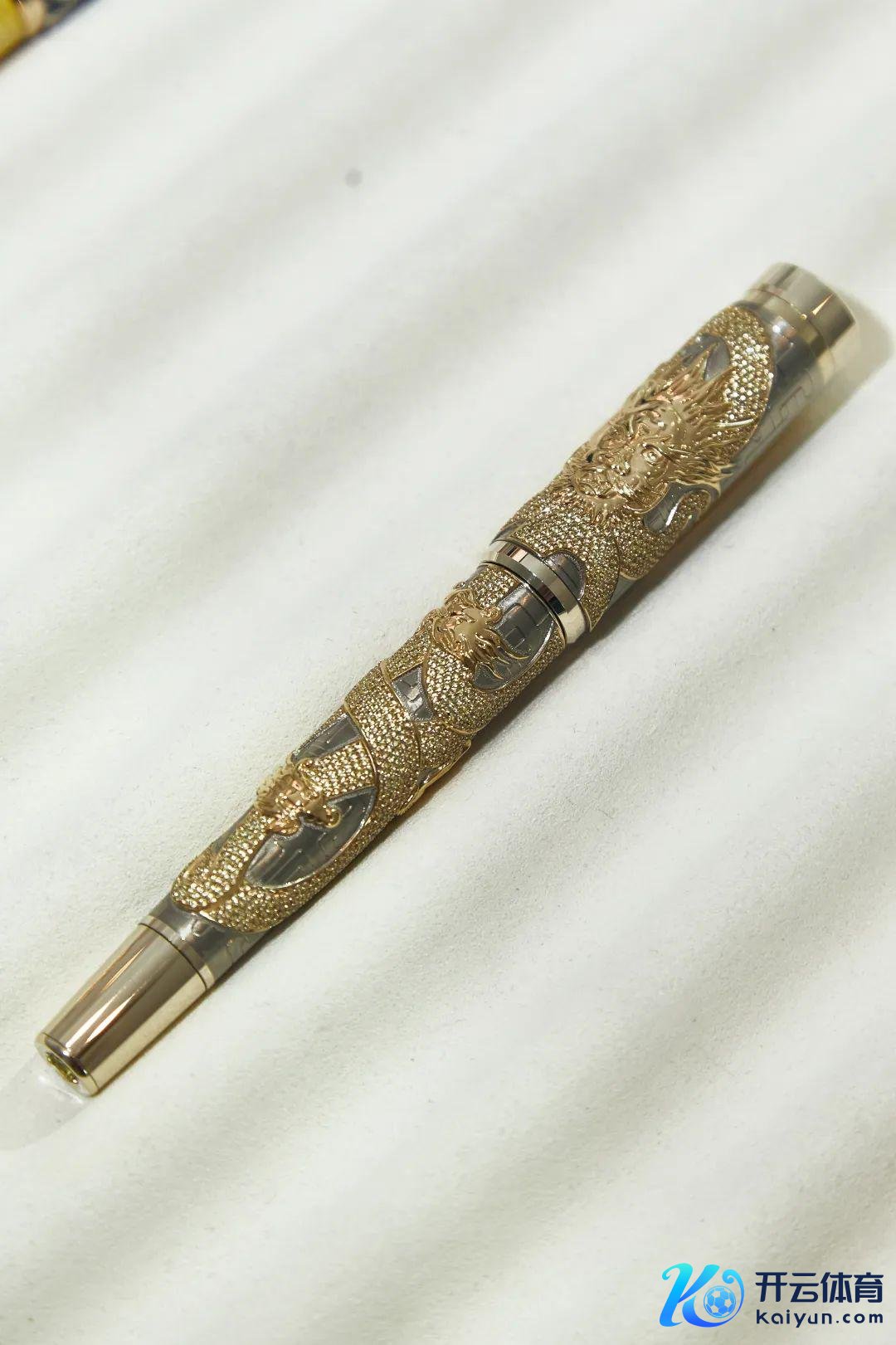 笔杆由一条白玉雕饰的蟠龙盘绕而上,龙身以璀璨的钻石勾画线条。