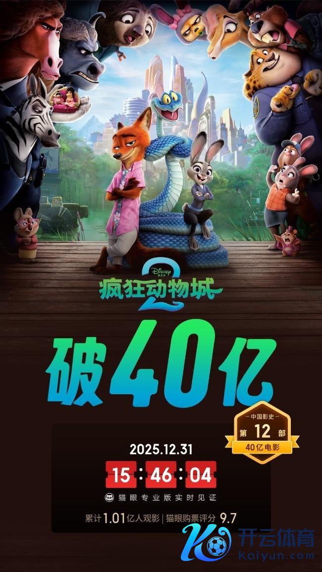 大皖新闻讯 据猫眼专科版数据,端正2025年12月28日下昼,电影《猖獗动物城2》上映33天,不雅影东说念主次破亿,成为中国影史首部不雅影东说念主次破亿的入口电影,亦然中国影史第7部不雅影东说念主次破亿电影。12月31日下昼开云体育(中国)官方网站,《猖獗动物城2》中国内地票房冲突40亿元大关,在2025年临了一天成为中国影史第12部票房40亿+的电影。